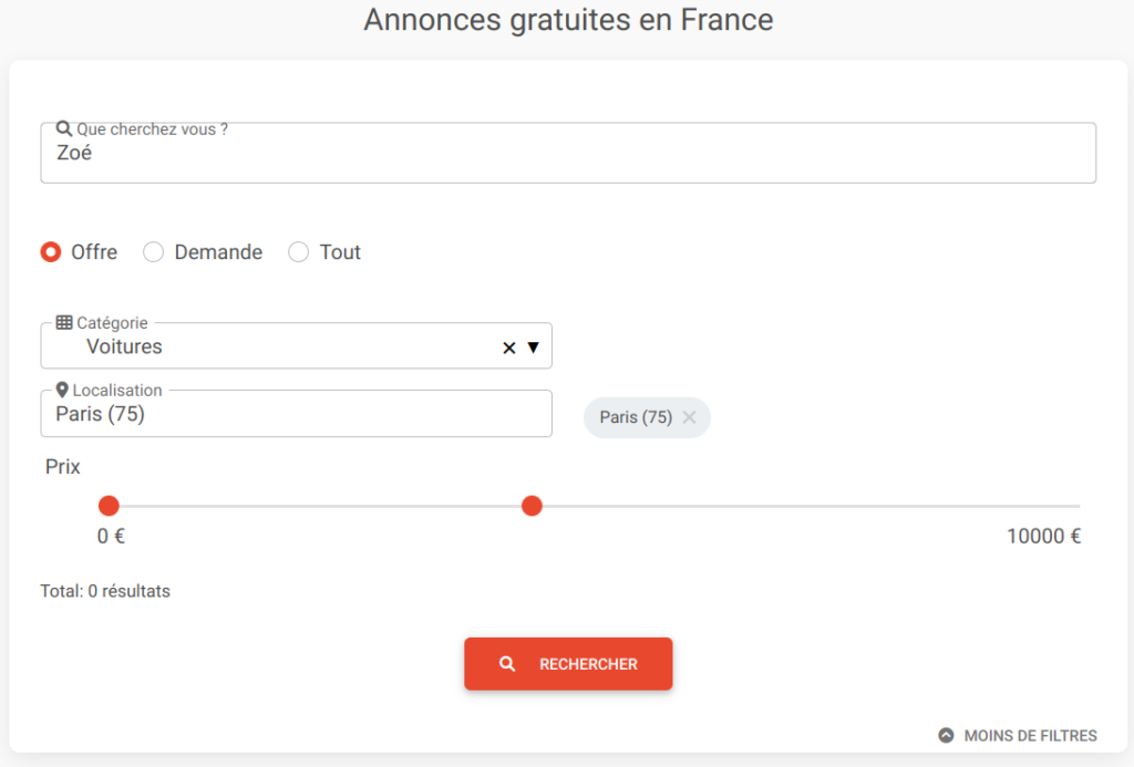 - Sélectionnez le type de l’offre à recherche: Offre: vente, location; Demande: Rechercher quelque chose