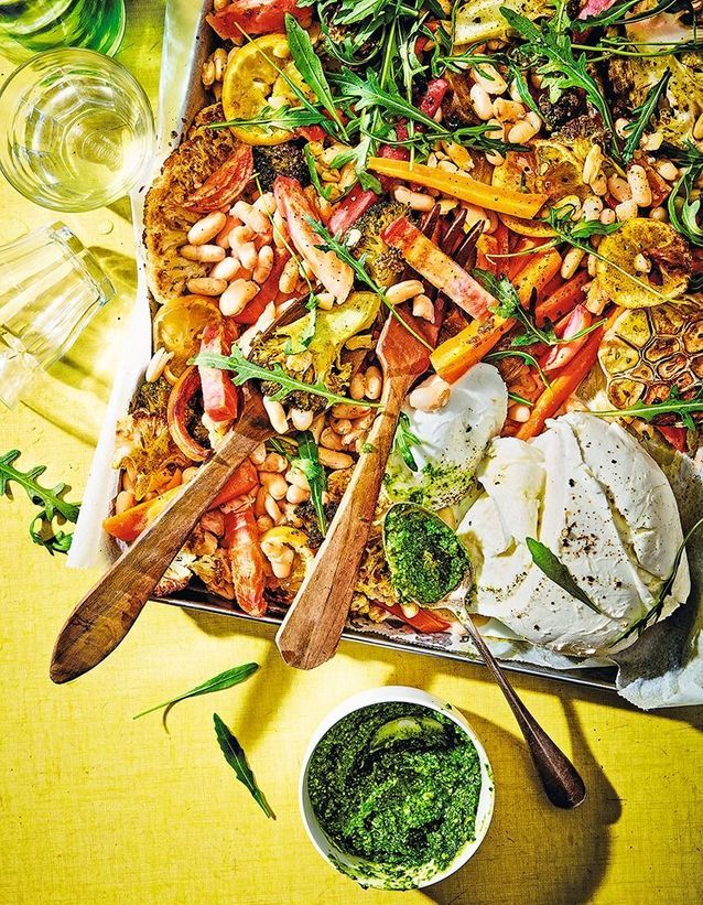 SALADE TIÈDE DE LÉGUMES RÔTIS AU FOUR, PESTO ET MOZZARELLA